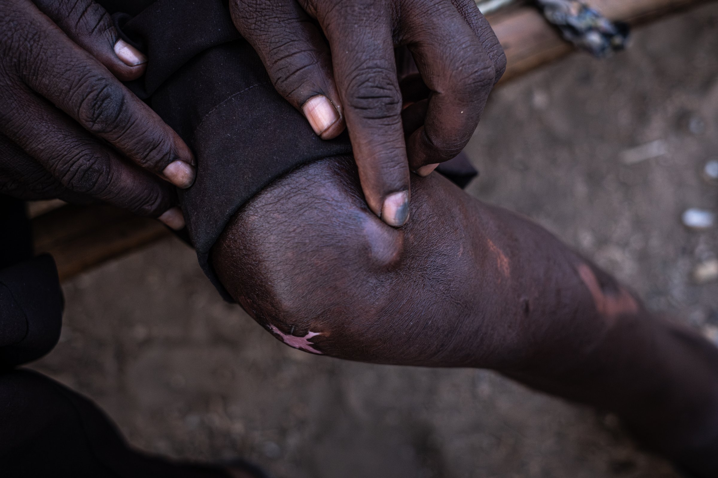 Hassan Koko montre ses blessures. Des morceaux de métal sont encore présents dans sa jambe.