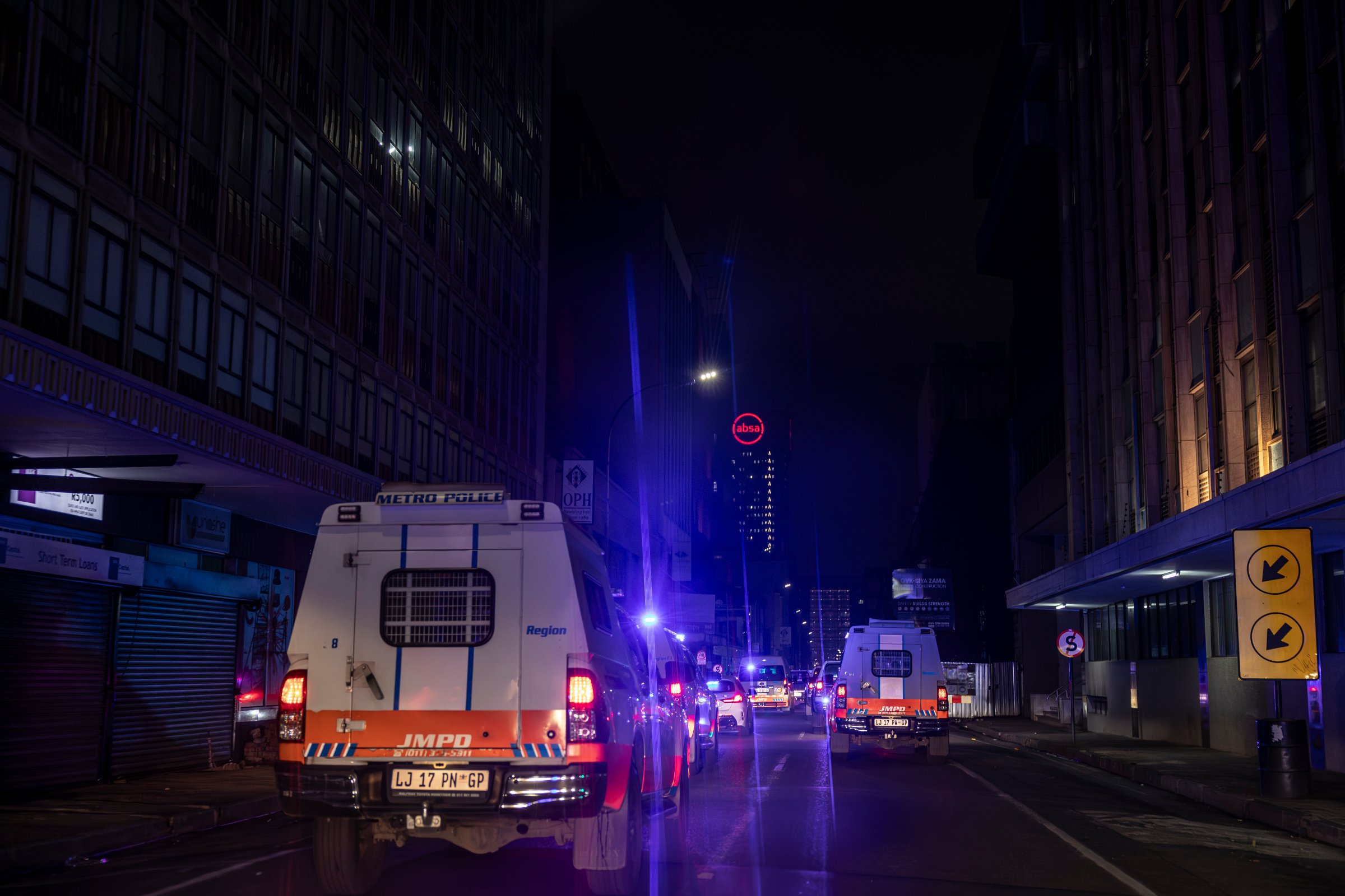 Des agents du Johannesburg Metro Police Department (JMPD) attendent à l’extérieur de l’immeuble illégalement occupé (18 décembre 2025).© Camilla Richetti -