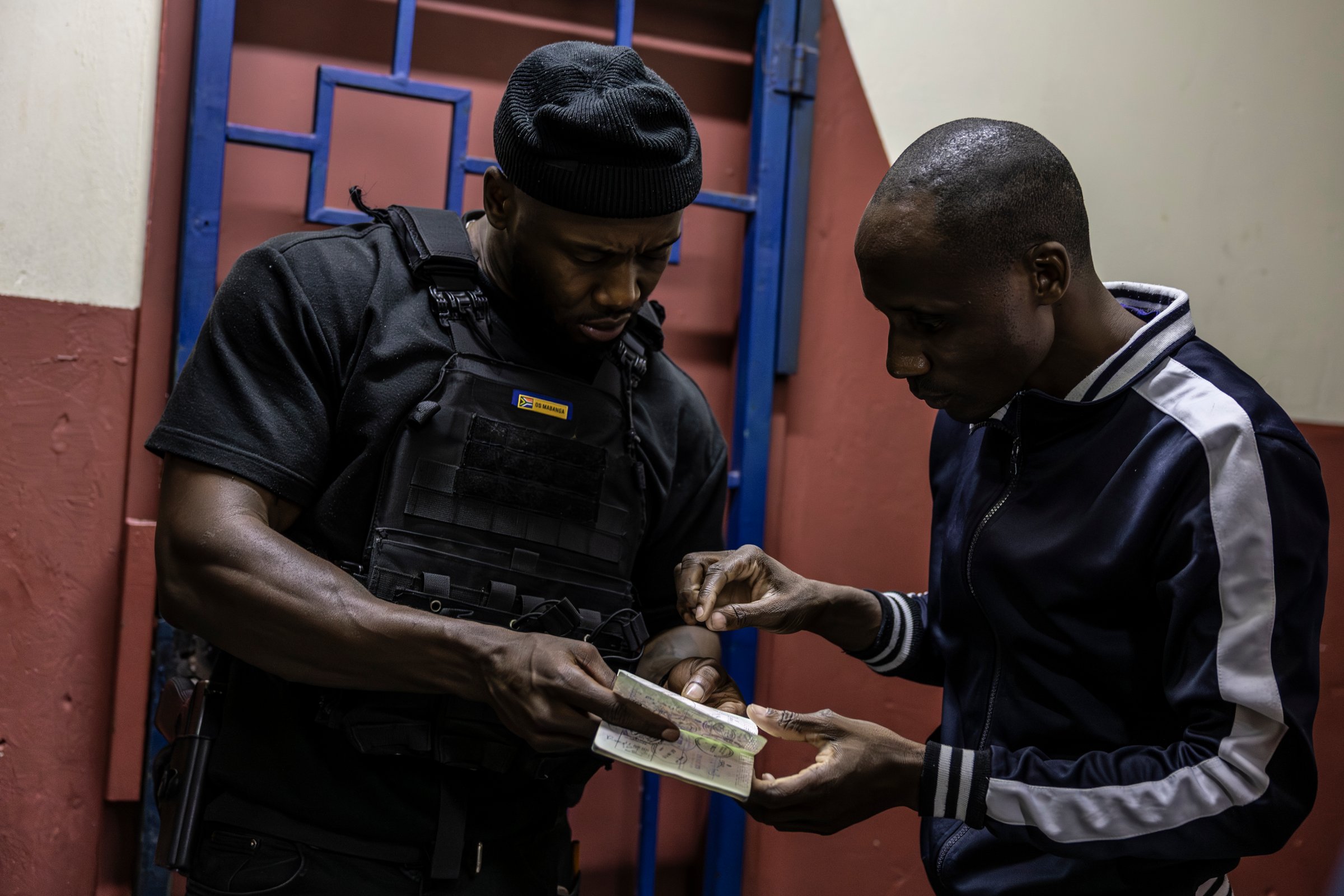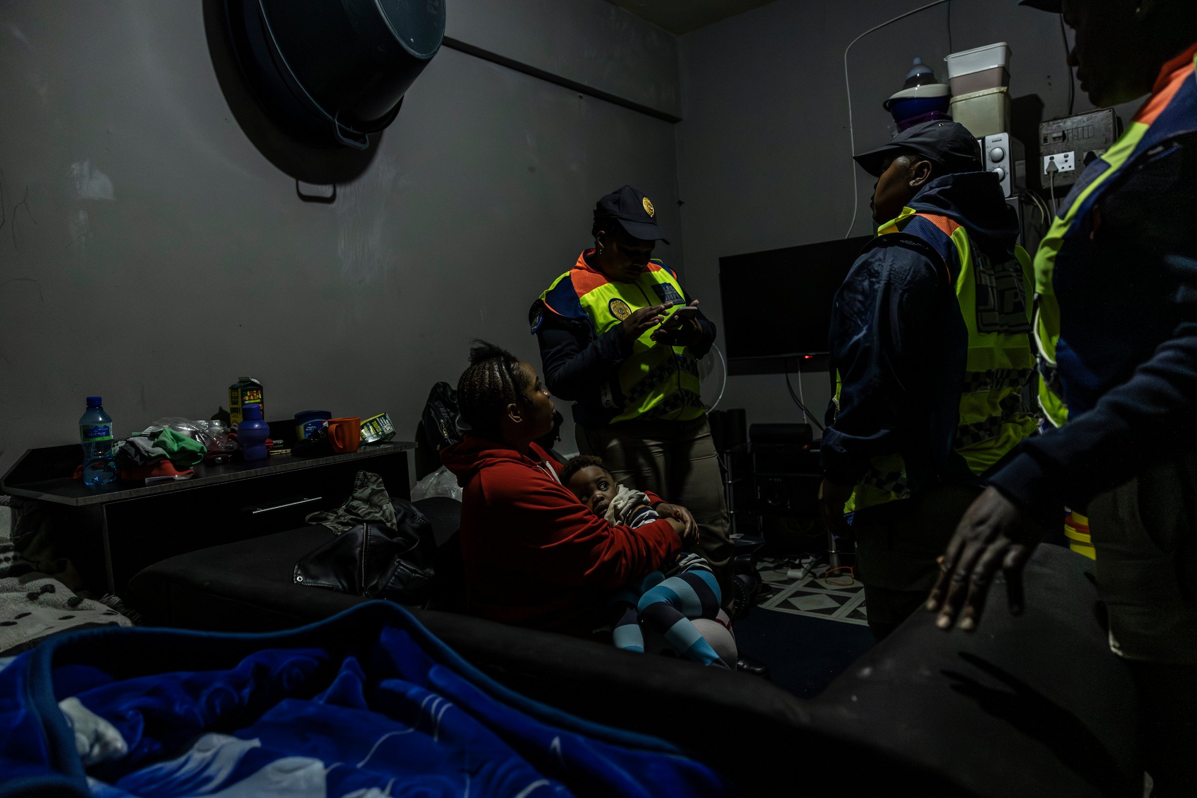 Des agents du Département de police métropolitaine de Johannesburg (JMPD) vérifient les papiers d’identité d’une mère dans un appartement d’un immeuble occupé illégalement (18 décembre 2025).© Camilla Richetti