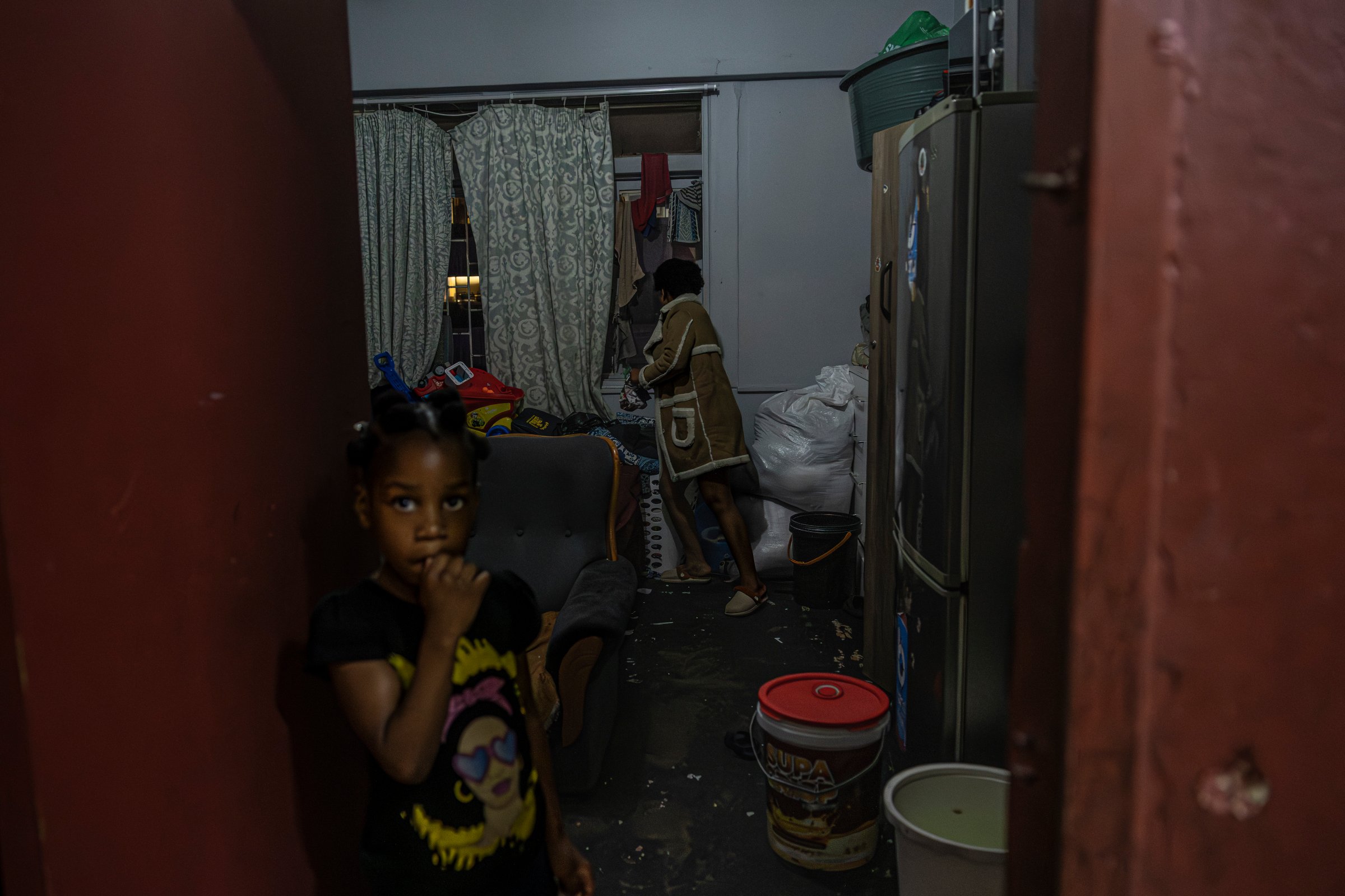 Selon les données municipales, environ 250 personnes vivent actuellement dans l’immeuble Zambesi, situé dans le Central Business District (CBD), et près de la moitié ne paieraient aucun loyer. Les photographies prises à l’intérieur montrent des appartements surpeuplés, des familles partageant une seule pièce, des matelas posés à même le sol et des installations électriques improvisées, souvent dangereuses. Comme beaucoup d’immeubles occupés du centre-ville, le Zambesi ne dispose pas d’un accès régulier à l’eau potable, à une alimentation électrique stable, ni à des installations sanitaires fonctionnelles, ce qui expose ses habitantes à des risques permanents d’incendie, d’effondrement et de maladies.