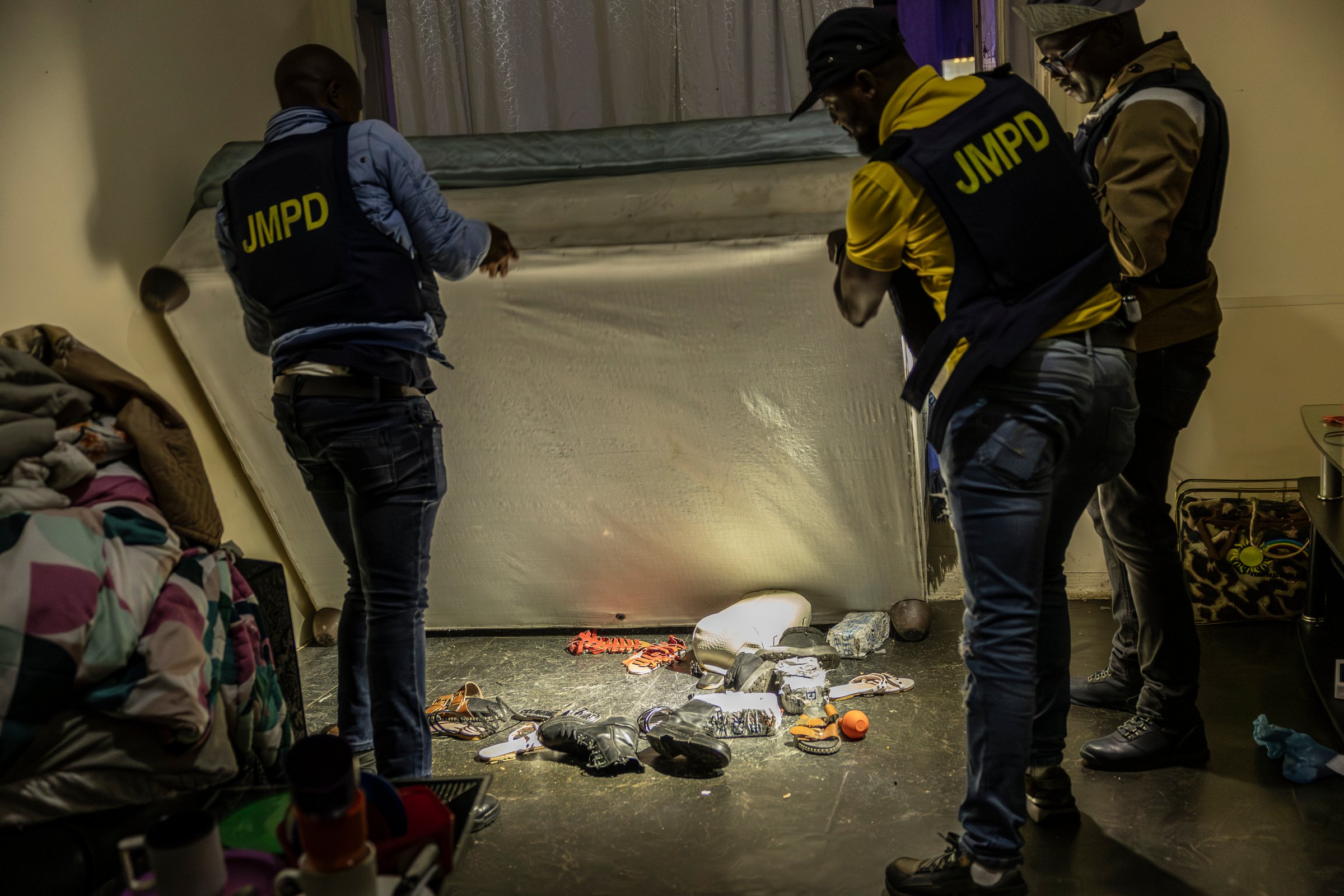 Des agents du Département de police métropolitain de Johannesburg (JMPD) inspectent sous le lit d’un résident (18 décembre 2025).© Camilla Richetti -