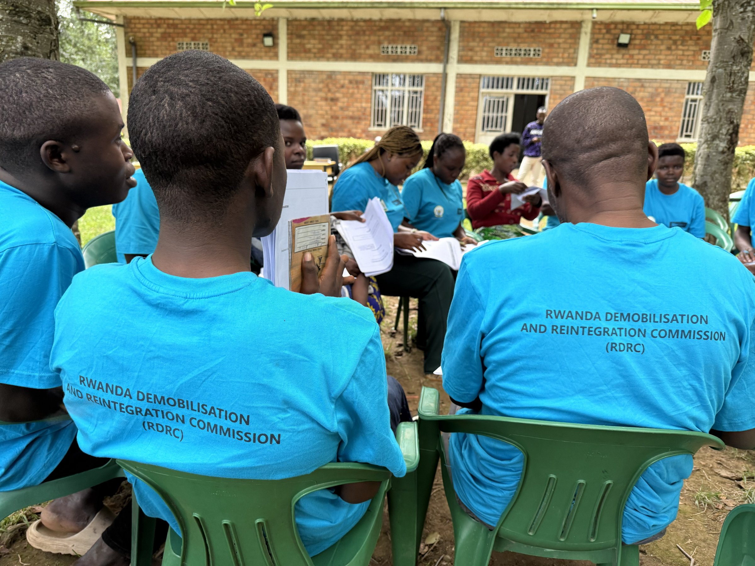 L'image montre un groupe de personnes assises à l'extérieur. Elles portent toutes des t-shirts bleu clair avec le texte "RWANDA DEMOBILISATION AND REINTEGRATION COMMISSION (RDRC)" imprimé au dos. On peut apercevoir des chaises en plastique vertes sur lesquelles elles sont assises. À l'arrière-plan, plusieurs personnes sont en train de discuter, et un bâtiment en briques apparaît légèrement flou derrière eux. L'ambiance semble conviviale et engagée, avec des participants qui semblent suivre une activité ou une formation en lien avec leur programme.