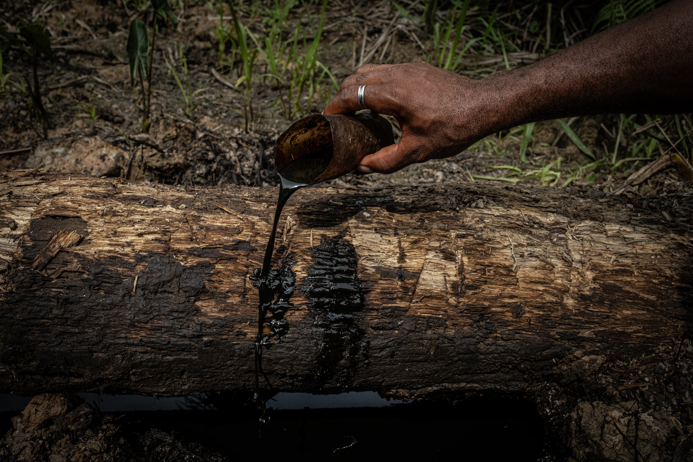 Le sentier forestier s’interrompt brusquement. Ce n’est pas immédiatement visible, mais le groupe guidé par Jim Dogo est arrivé sur une berge habituellement occupée par le fleuve. Un pont sommaire, un tronc de palmier long de cinq ou six mètres, mène à son lit. Non pas vers l’autre rive, mais exactement à l’endroit où l’eau s’écoulait autrefois. Pour contenir la propagation du pétrole, le cours d’eau a été recouvert de terre. La surface, bordée de noir, est irrégulière : des troncs émergent de flaques visqueuses. L’un des accompagnateurs de Jim, un jeune homme de la communauté d’Etiema, timide et peu à l’aise en anglais, récupère le fond d’une bouteille en plastique, s’en sert pour recueillir le liquide au sol et le verse sur du bois : c’est noir, épais, presque du pétrole brut à l’état pur. Après une demi-heure passée sur cet îlot artificiel, le sol s’est déjà affaissé de plusieurs centimètres.